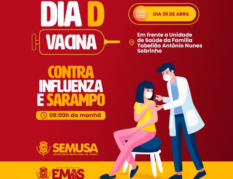 O Dia D de vacinação contra a Influenza (gripe) e Sarampo será realizado neste sábado, dia 30 de Abril. A vacinação terá início as 08h da manhã em frente a Unidade de Saúde da Família.
