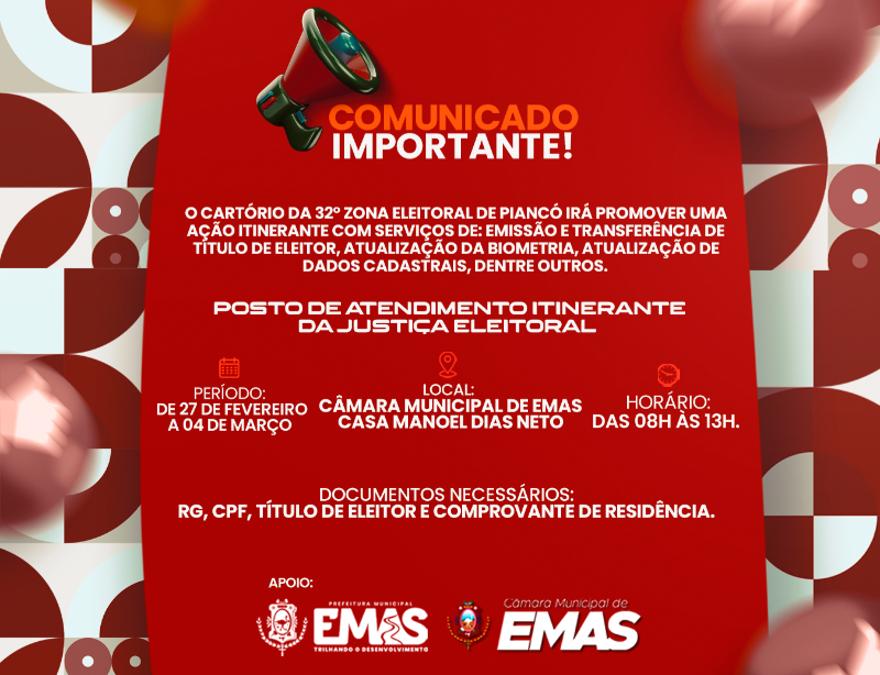 O Cartório da 32° Zona Eleitoral de Piancó, com apoio da Prefeitura de Emas e da Câmara de Vereadores, irá promover uma ação itinerante com serviços de: emissão e transferência de título de eleitor, atualização da biometria, atualização de dados cadastrais, dentre outros.