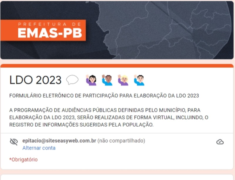 A Prefeitura de Emas disponibilizou um formulário para estimular a participação da população no processo de sugestões para formulação da Lei de Diretrizes Orçamentárias (LDO) referente ao período de 2023.
