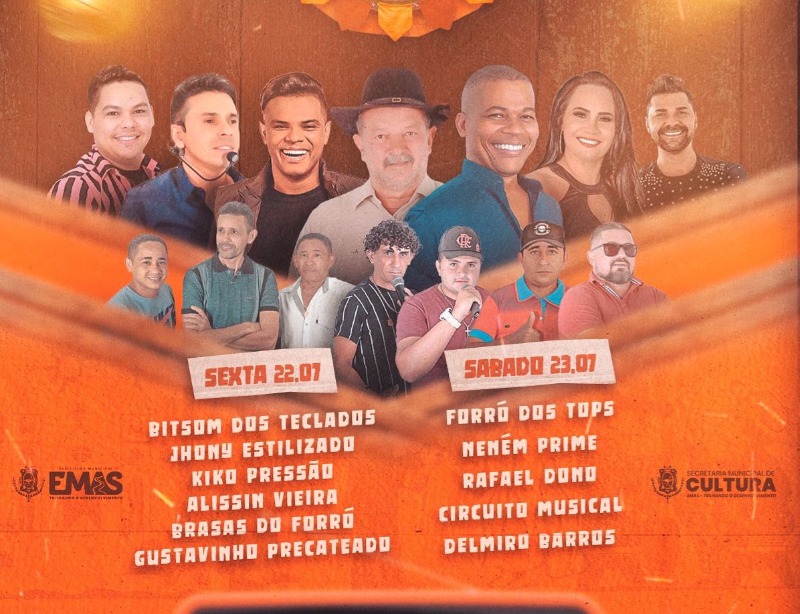 A primeira noite de festa será no sábado (22) ao som de Bitson dos Teclados, Jhony Estilizado, Kiko Pressão, Alissin Vieira, Brasas do Forró e Gustavinho Precateado. No domingo, dia 23, se apresentam Forró dos Tops, Neném Prime, Rafael Dono, Circuito Musical e Delmiro Barros.